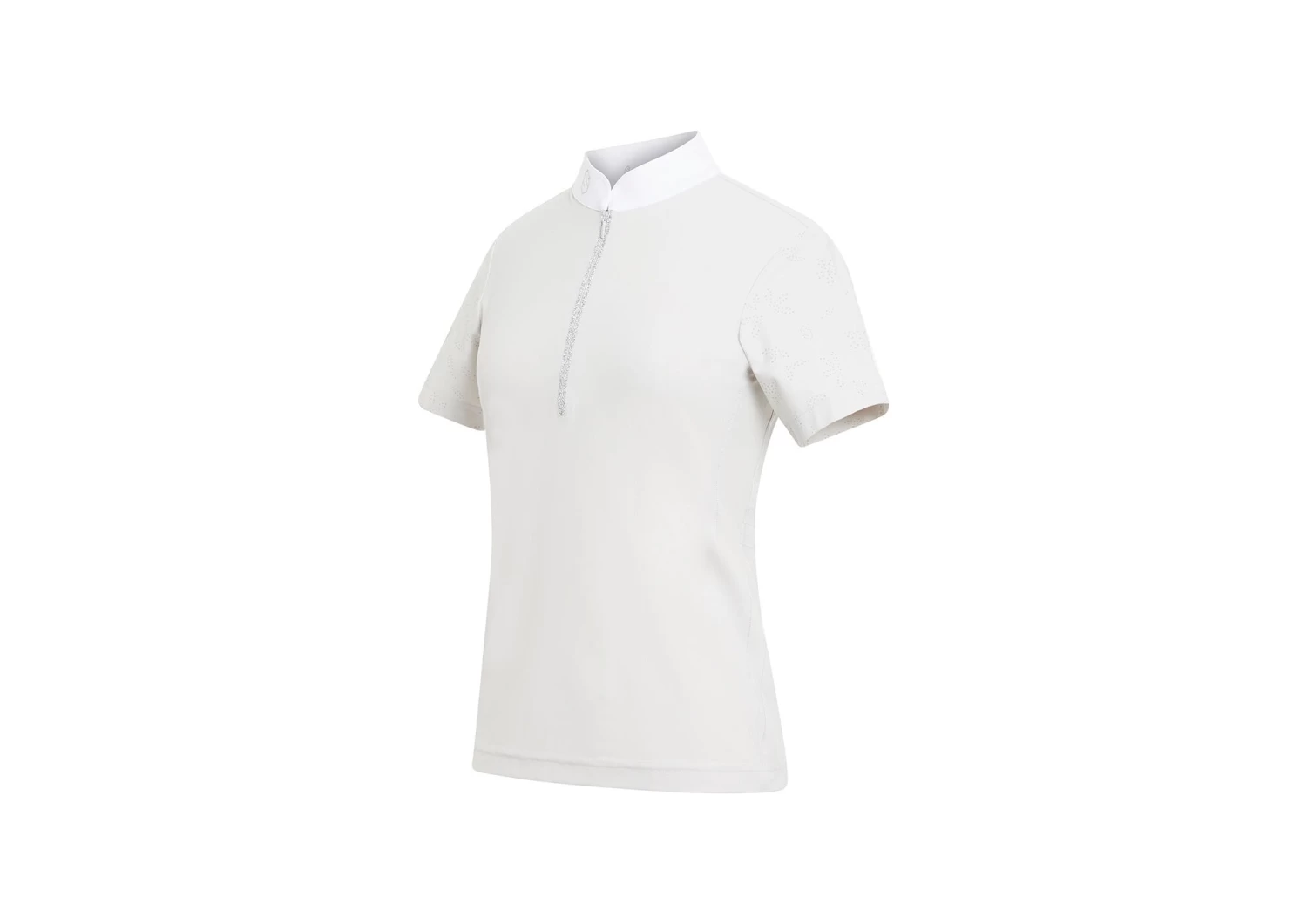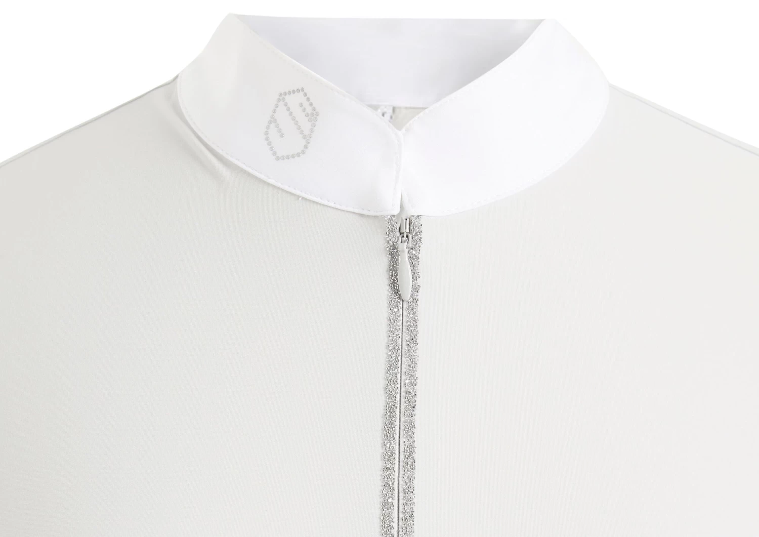 This competition shirt has a white collar and Swarovski rhinestones along the front zipper. The competition shirt Aloise is made in a soft and stretchy fabric for best fit and comfort.Â