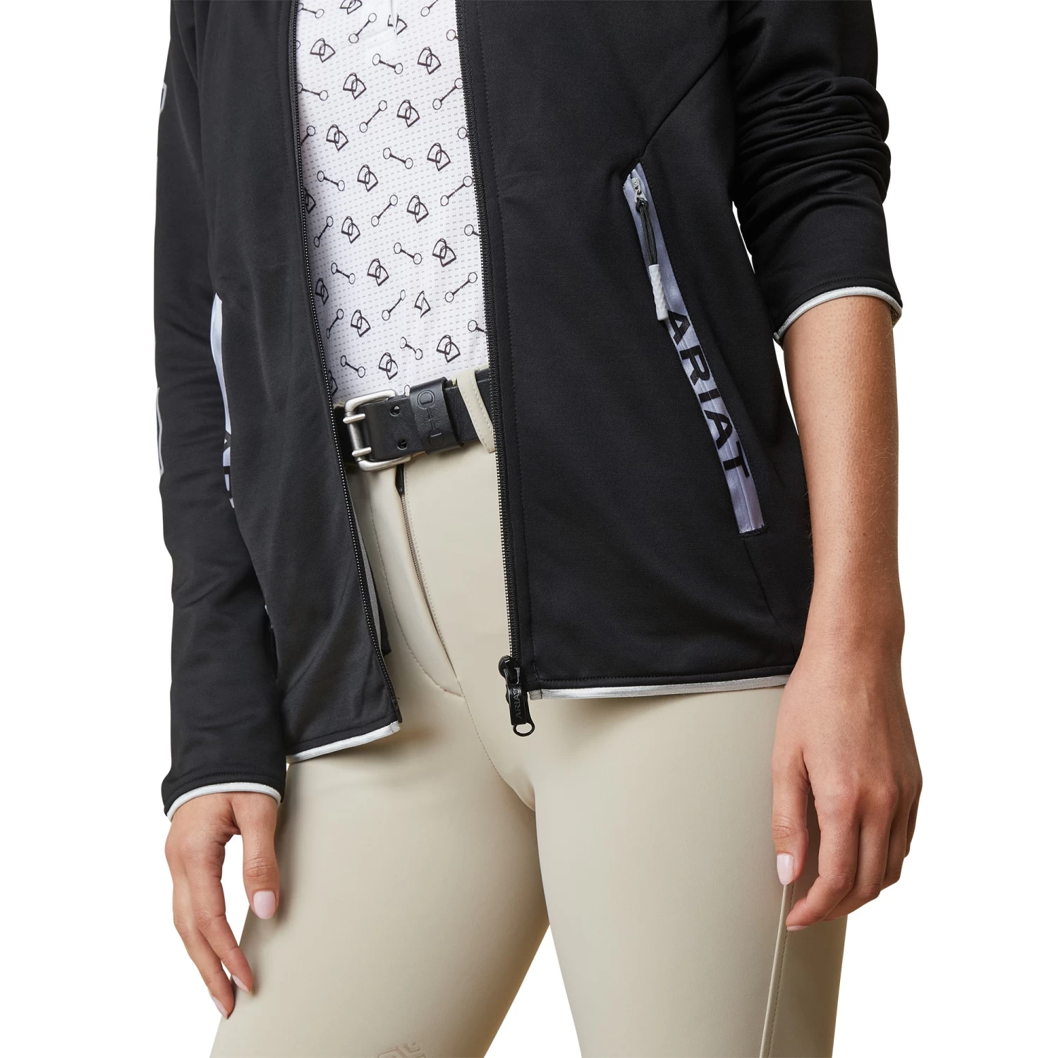 Byron Zip Hoodie is made in recycled technical fleece with stretch. This riding sweater is moisture wicking and has a full two-way zipper. The rididng sweater from Ariat is in the color Black with details in grey, as the logotype on the sleeve.Â