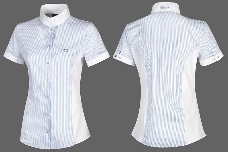 The shirt is fitted, short-sleeved and blue-white with a portion of only white along both sides. Even the collar is white with Equline text in blue in the neck. The text also matches Equiline’s logo of three horses that are discreetly embroidered on the left breast. The shirt is very comfortable and perfect to wear in the summer.
