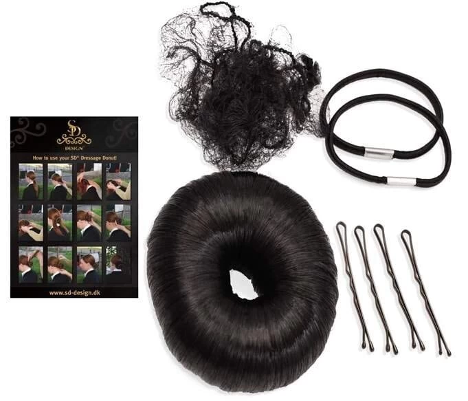 The package includes a hair donut, a large hair net and hairpins. Everything you need to make a nice hair set for the competition. Or to the party.