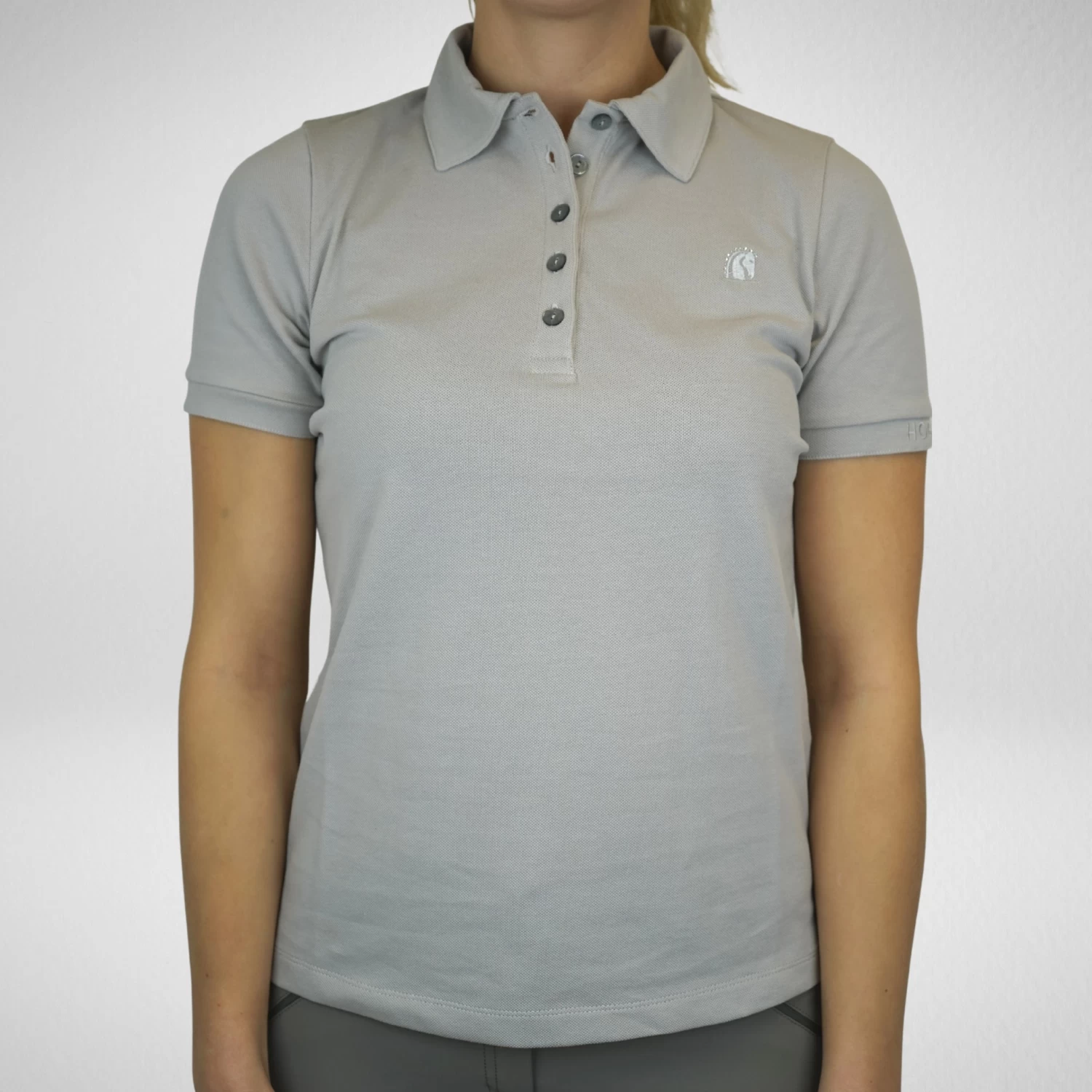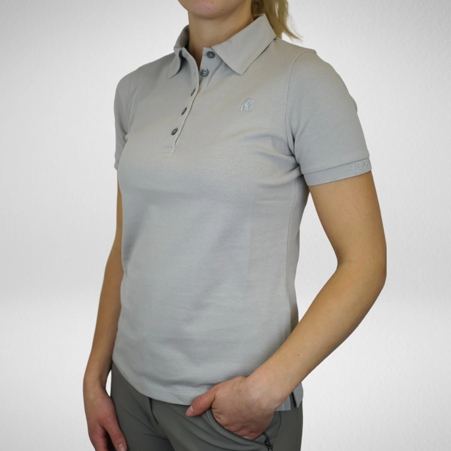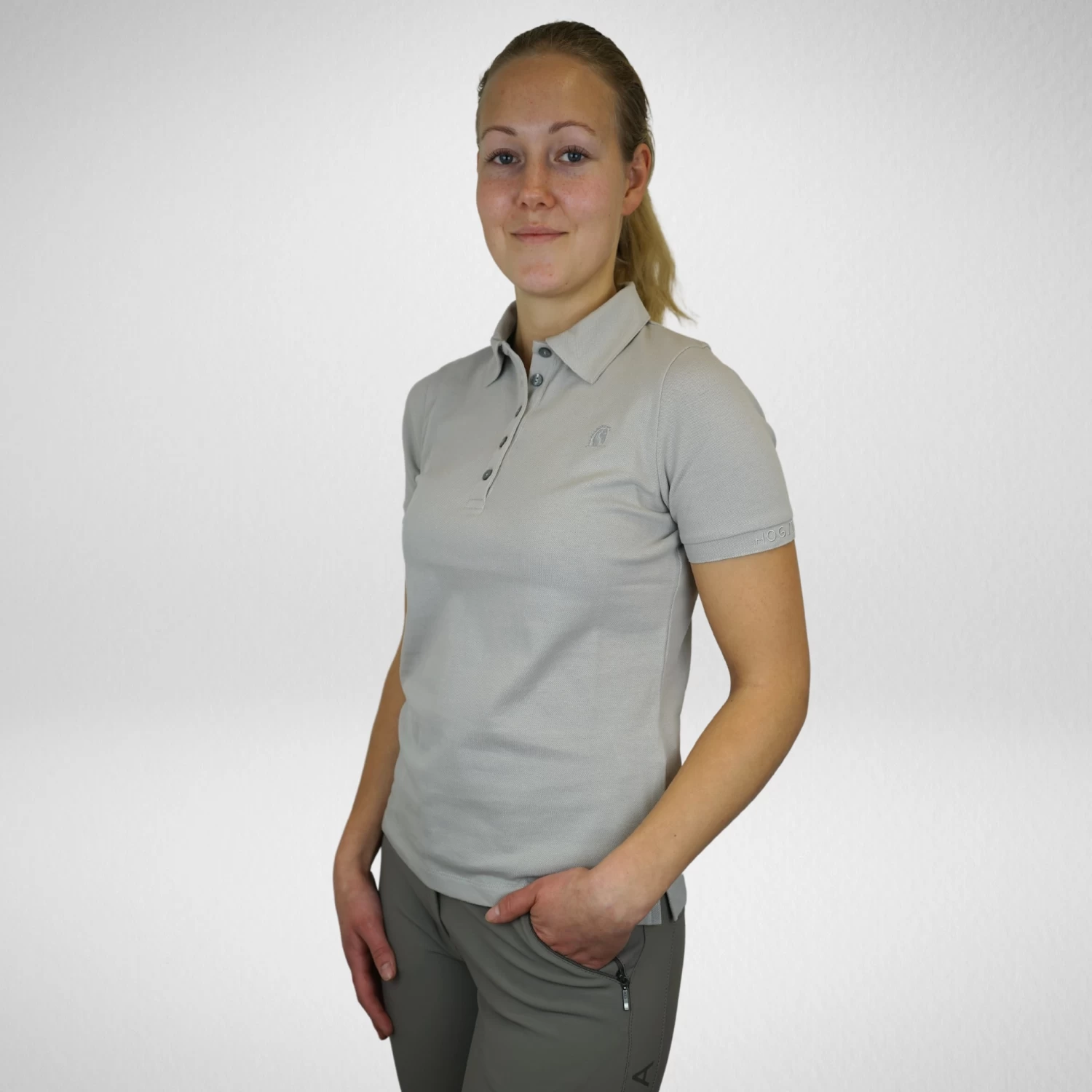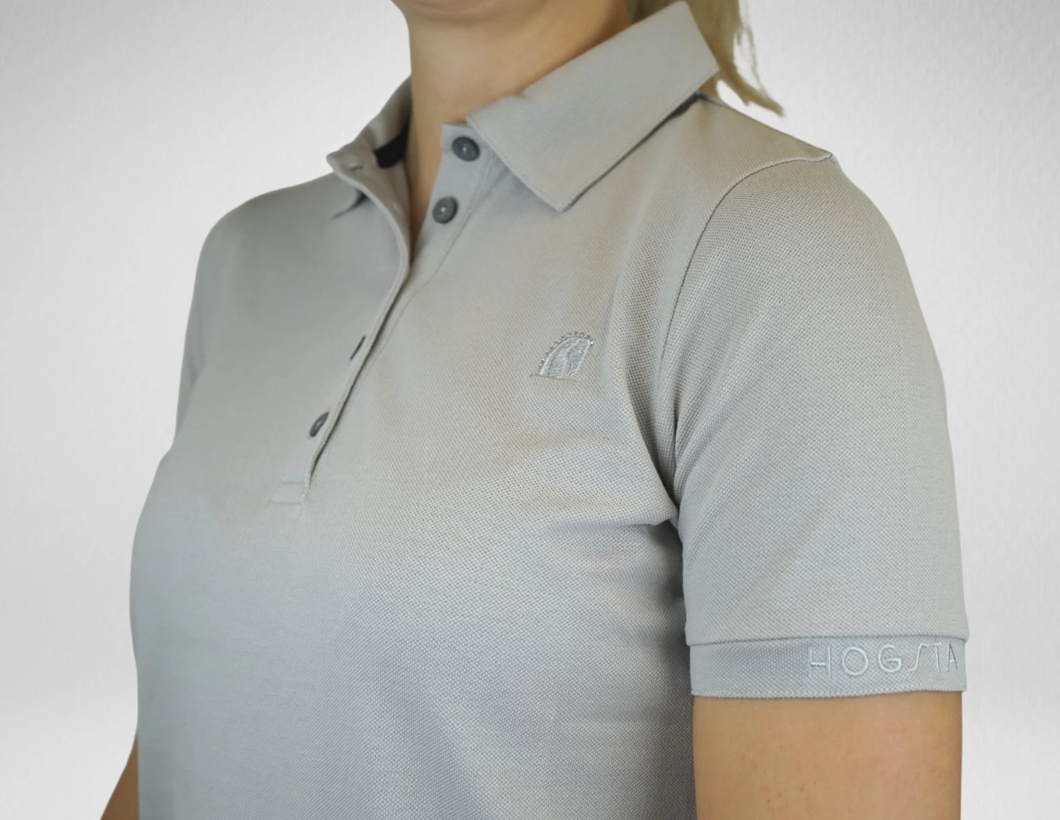 This polo shirt has a slim fit and plain design, featuring the Hogsta embroidered logo with rhinestone details on the chest and on the left cuff, both details goes tone in tone with the beige color of the shirt. The polo is decorated with five toneintone buttons at the front, which is both a neat details but also makes the polo easy to put on and take off.