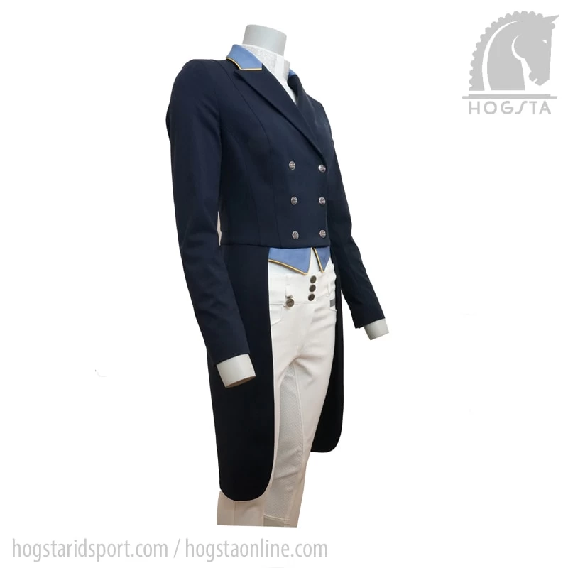 The dressage tail coat Lageo from Animo is navy blue with a light blue collar and cuffs. A narrow yellow piping further enhances the look of this stylish dressage coat. The material is stretchy, water-repellent and dirt-repellent.