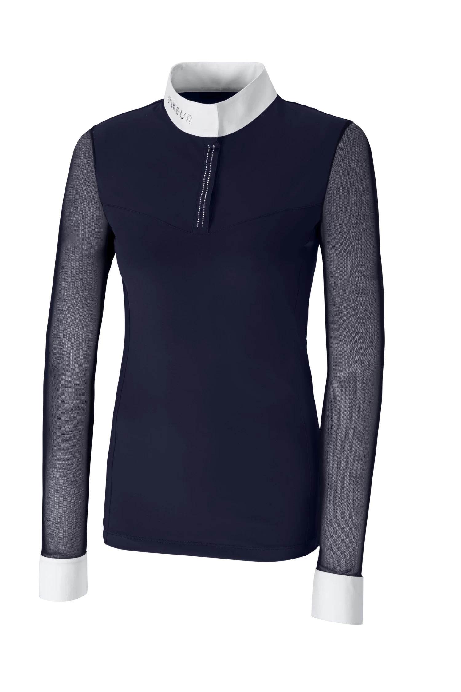 With this competition shirt from Pikeur you will guaranteed be the prettiest on the competition site. Elonie Competition Shirt comes in a beautiful navy blue color with a white collar with Pikeur written with small crystals and white cuffs with hidden press studs. The shirt has mesh sleeves for best comfort on hot summer days. You can easily open up the collar with hidden buttons at the front that are adorned with crystals.