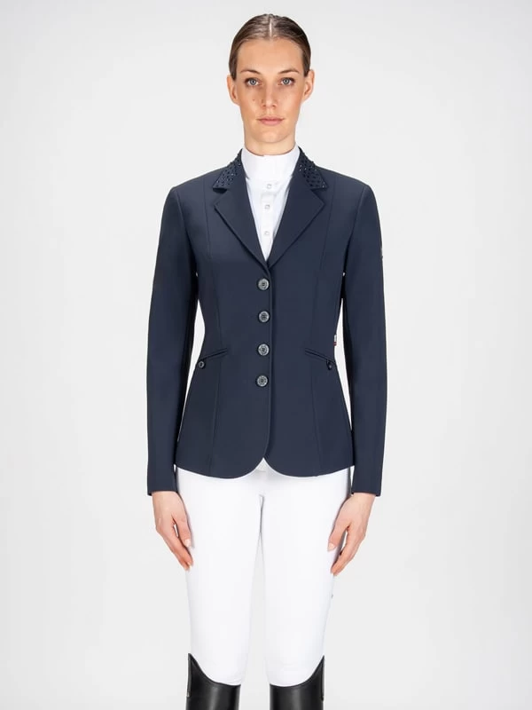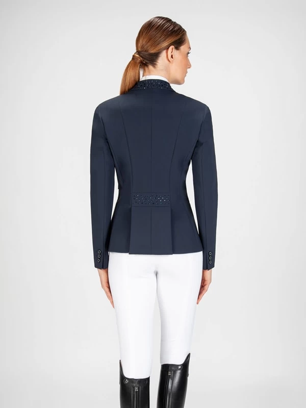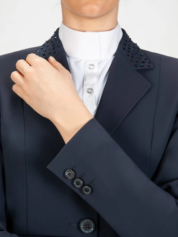 Gioia dressage jacket has a beautiful design with a well-designed shape for the highest elegance and comfort during the competition. Collar with rhinestone element ton in tone and buttons with discrete rhinestones further enhance the elegance.