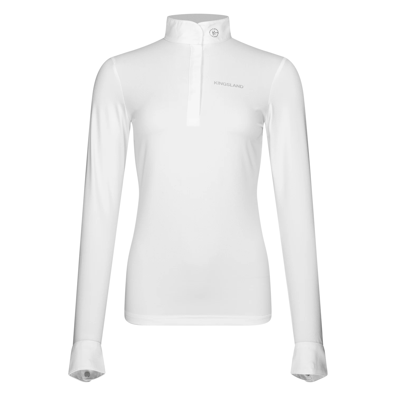 KLgloria is a stylish and soft competition shirt. The competition shirt is white with Kingsland on the left chest and K with glittering stones on the collar. Thanks to its material, the competition shirt from Kingsland is very stretchy and flexible, perfect under the competition jacket! Material: 92% nylon, 8% elastane (spandex) Color: White