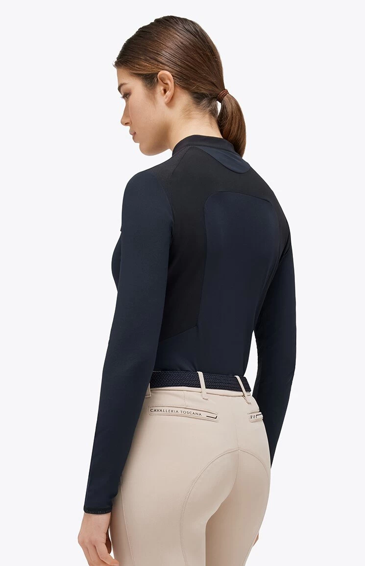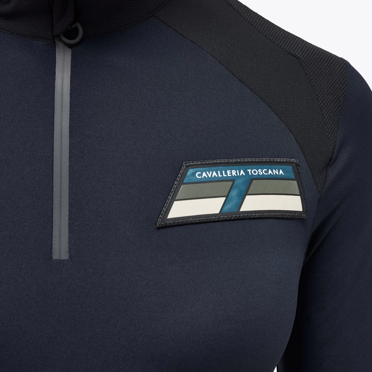 The shirt has airy fabric parts on shoulders, neck and on the sides of the back. This both increase the mobility in the sweater and also gives it a sporty and stylish impression. The shirt has a nice multi colored logo on the chest.