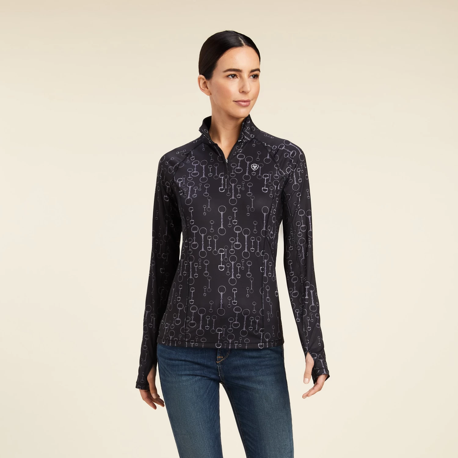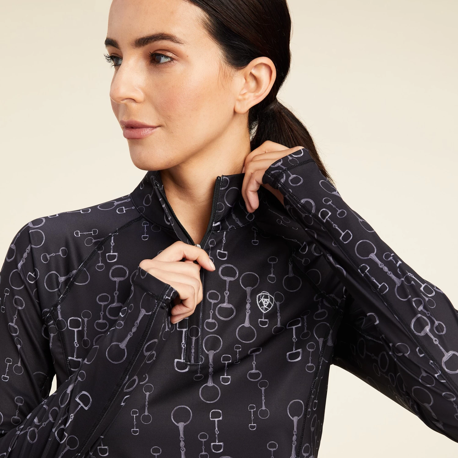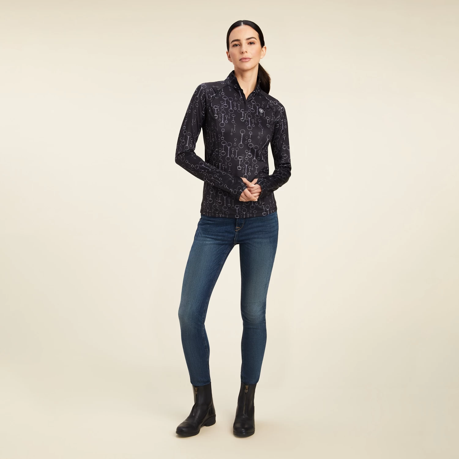 Ariat Lowell 2.0 1/4 Baselayer is a thin, comfortable riding sweater that is stylish enough to be used as the only garment. The riding jersey from Ariat is made with a material mix with a perforated thinner fabric under the sleeves and along the underside of the sleeves for best comfort during training. The material Ariat’s Moisture Movement Technology ™ draws moisture away from the skin to keep you dry. The lowell riding sweater has thumb holes so it is easy to pull on an upper sweater. 1/4 long zipper on the polo collar, smooth seams and super strechy material.Â