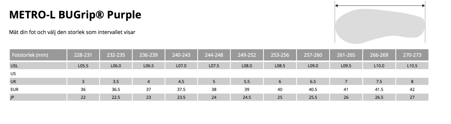 Insulating sole and fleece lining makes METRO2 W BUGRIP® a warm and comfortable shoe that can handle -20 degrees. Twisted sole with roll gives the foot a good anatomical movement and the comfortable reading is specially developed for Nordic feet. The reinforcement along the sole edge is easy to handle and waterproof.