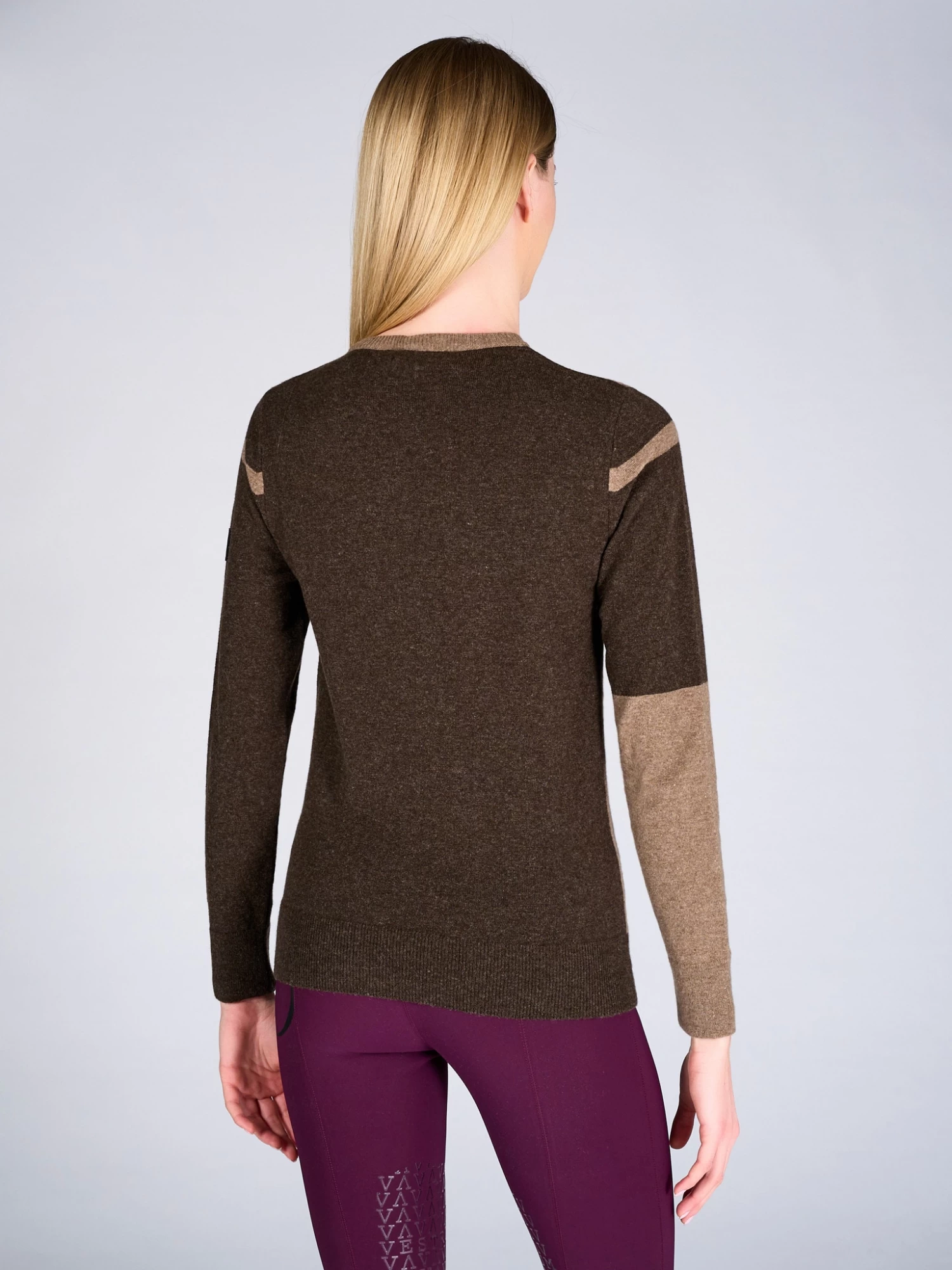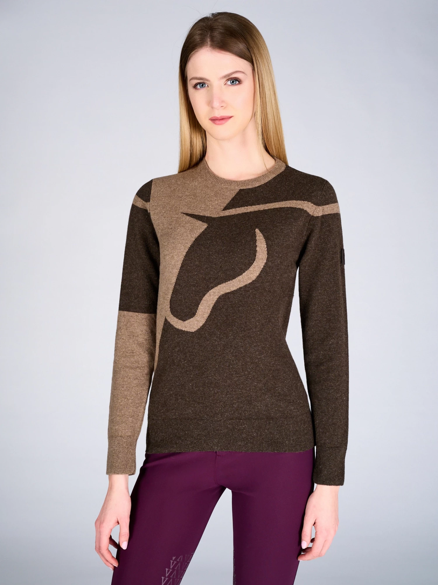 San Cassiano Knitwear is a stylish knitted sweater in a feminine model. The sweater is in a beautiful dark brown color that is contrasted by a light brown color, which creates nice patterns, e.g. in the form of a horse’s head across the chest.Â