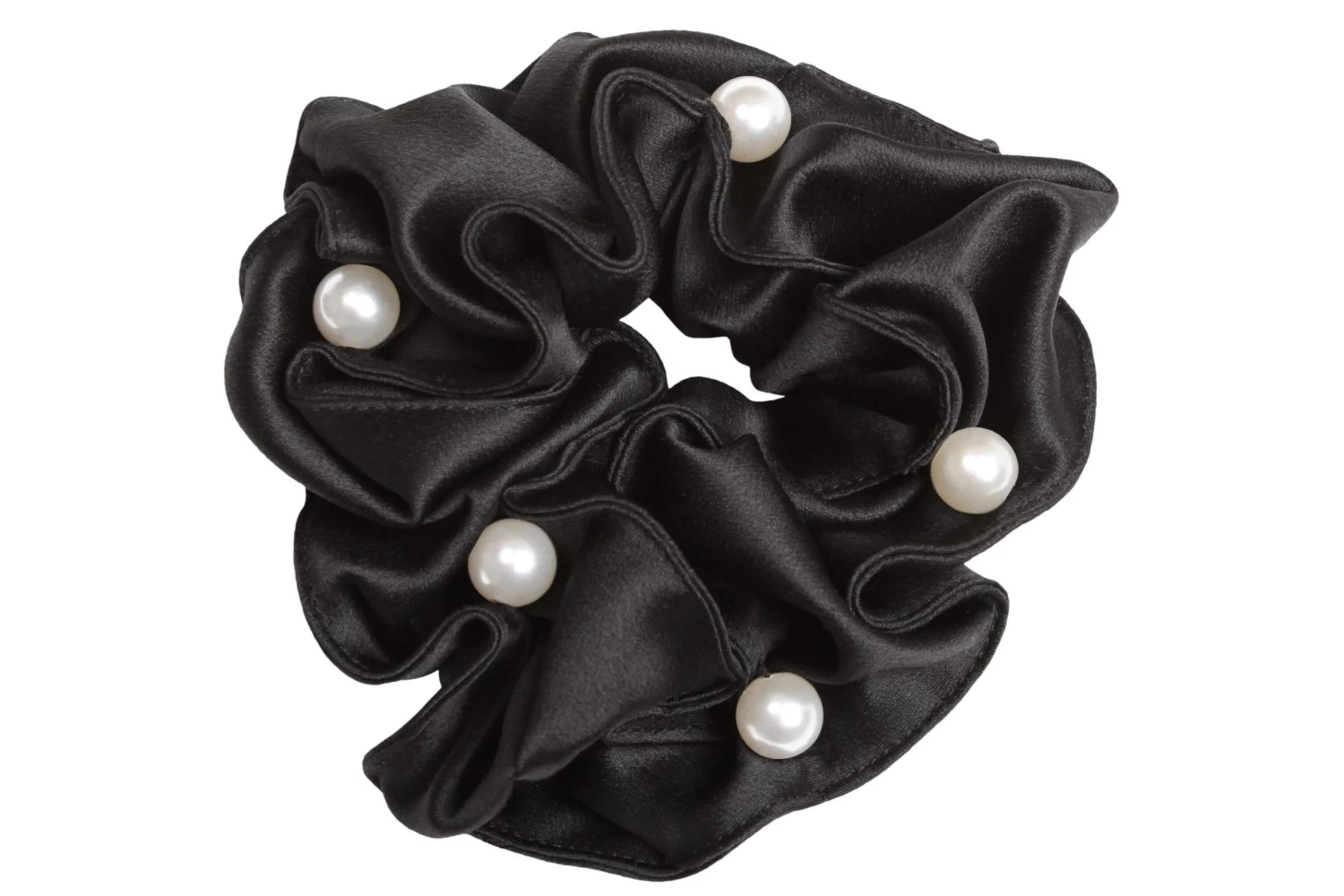 This is an elastic scrunchie with pearls on satin from SD Design.