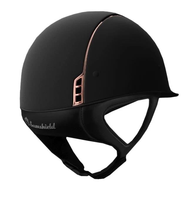 Shadowmatt 5 Swarovski is available in the colors black, brown and navy and this riding helmet has a dressage cut where the neck piece is narrower to make room for the hair set below.