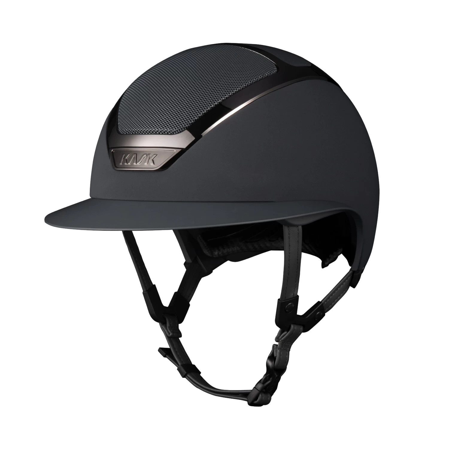 The ultimate riding helmet, this riding helmet with its wide front visor, has quickly become a favourite among riders. The front visor on KASK Star Lady riding helmet does a good job when it comes to keeping the sun out of your eyes! Featuring a self-adapting system around the neck that gives an optimum fit and gentle support. The soft eco leather chin strap is hypoallergenic and washable. Removable and washable inner lining for easy adjustment of size.