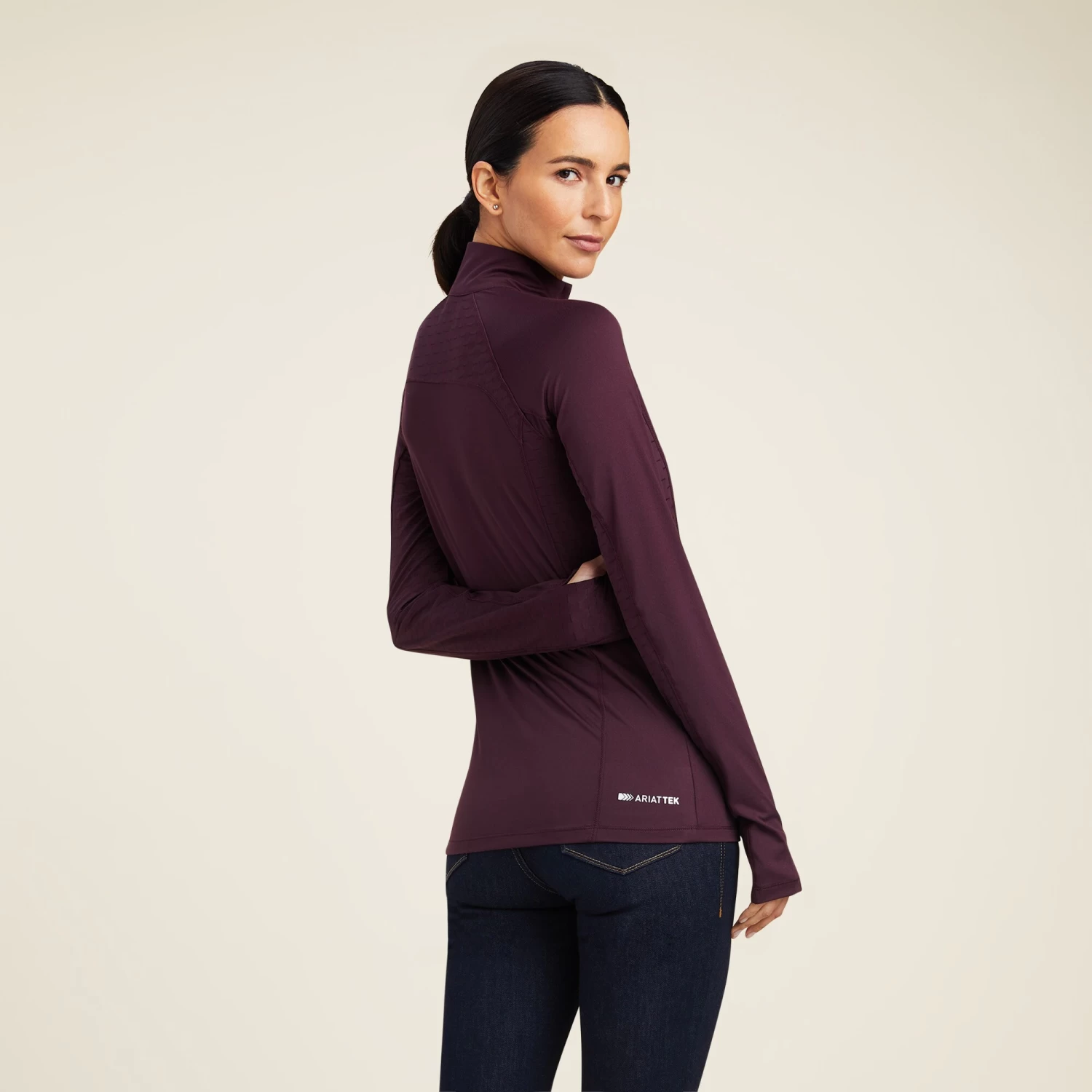 Ariat Lowell 2.0 1/4 Baselayer is a thin, comfortable riding sweater that is stylish enough to be used as the only garment. The riding jersey from Ariat is made with a material mix with a perforated thinner fabric under the sleeves and along the underside of the sleeves for best comfort during training. The material Ariat’s Moisture Movement Technology ™ draws moisture away from the skin to keep you dry. The lowell riding sweater has thumb holes so it is easy to pull on an upper sweater. 1/4 long zipper on the polo collar, smooth seams and super strechy material.Â